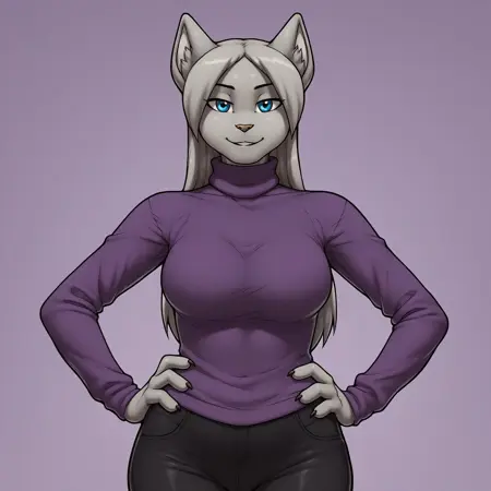 Positive Prompts: AgathaJW, furry, anthro, feline, female furry, inner ear fluff, black eyebrows, thin eyebrows, light-brown nose, grey hair, ponytail, long hair, blue eyes, black pupils, square glasses, eyewear, grey body, grey fur, grey tail, long tail, big breasts