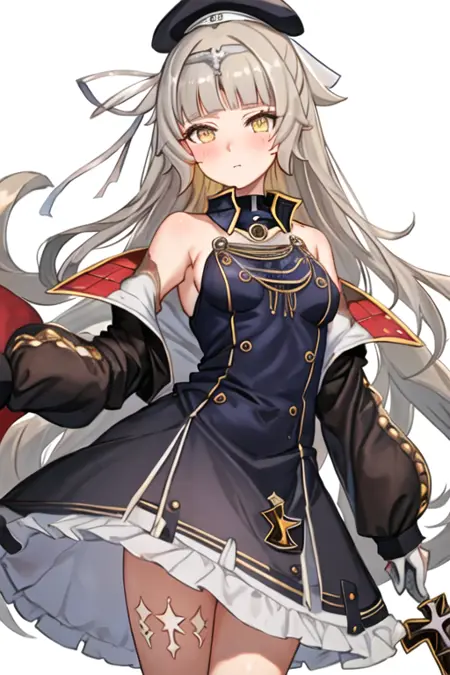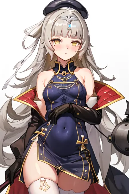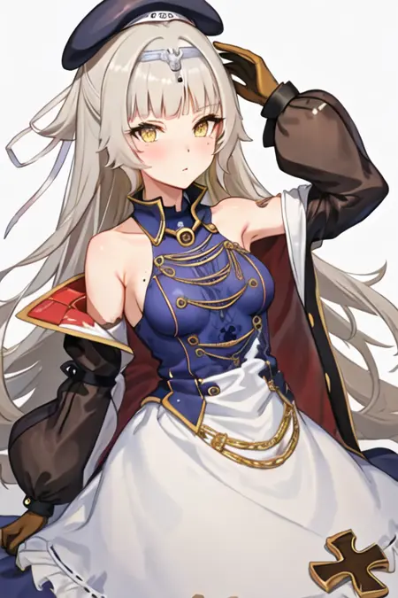 トリガー単語はz46_azurlane、推奨タグはbest quality, masterpiece, highres, solo, {z46_azurlane:1.15}, long_hair, bangs, yellow_eyes, grey_hair, mole, mole_under_eye, blush, hat, blunt_bangs, very_long_hair, cross, iron_cross, breasts, small_breasts, brown_eyesです。