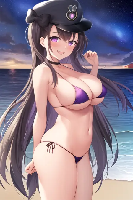 The trigger word is pamiat_merkuria_azurlane, and the recommended tags are best quality, masterpiece, highres, solo, {pamiat_merkuria_azurlane:1.15}, long_hair, breasts, blush, purple_eyes, large_breasts, black_hair, smile, bangs, open_mouth, hat, one_side_up, white_headwear.