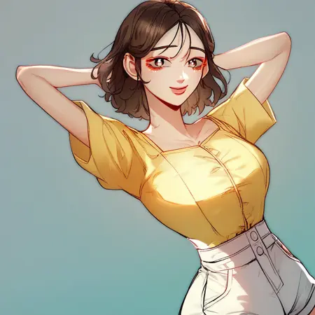 4. ((短袖黄色上衣,巨大乳沟,淫秽乳沟,白色短裤,))