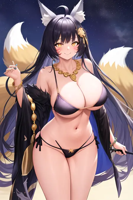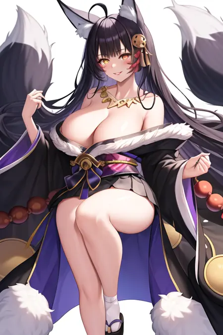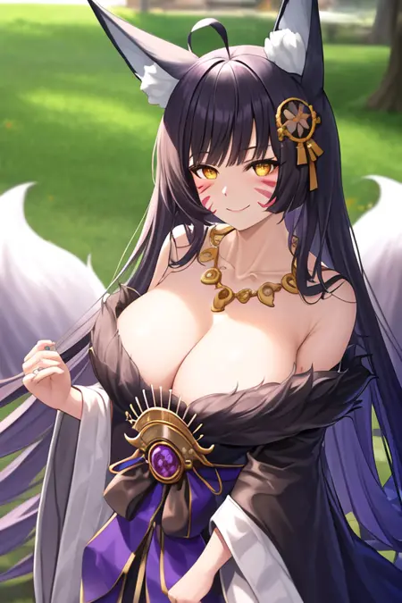 触发词为 musashi_azurlane,推荐标签为:best quality, masterpiece, highres, solo, {musashi_azurlane:1.15}, animal_ears, long_hair, fox_ears, animal_ear_fluff, black_hair, facial_mark, breasts, bangs, hair_ornament, yellow_eyes, large_breasts, fox_girl, cleavage, jewelry, necklace, very_long_hair, magatama, magatama_necklace, smile, blush, ahoge。
