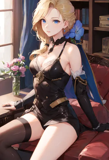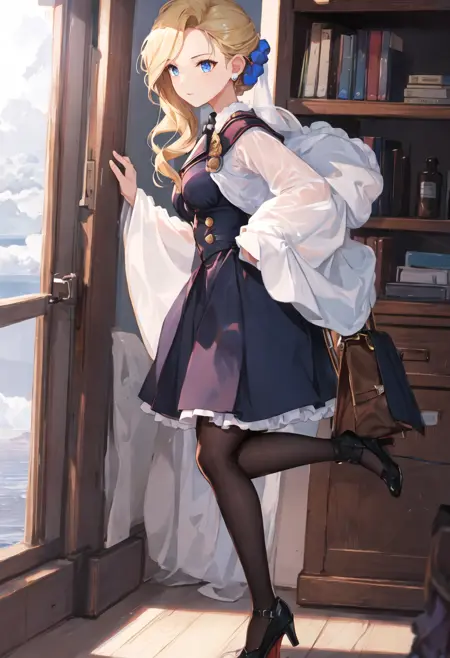 - The pruned character tags are blonde_hair, long_hair, blue_eyes, breasts, hair_over_shoulder, large_breasts, earrings. You can add them into prompts when core features (e.g. hair color) of character is not so stable.