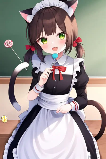 The trigger word is mutsuki_azurlane, and the recommended tags are best quality, masterpiece, highres, solo, {mutsuki_azurlane:1.15}, animal_ears, cat_ears, brown_hair, open_mouth, green_eyes, twintails, hat, short_twintails, short_hair, ribbon, blush, school_hat, yellow_headwear, low_twintails, animal_ear_fluff, smile, fang, tail, bangs, cat_tail, candy, food, bow, cat_girl, ears_through_headwear.