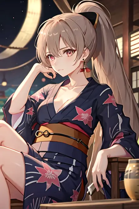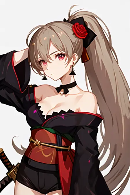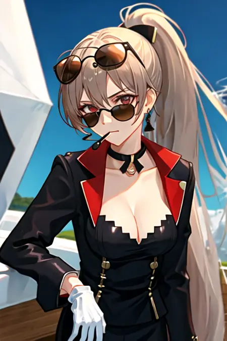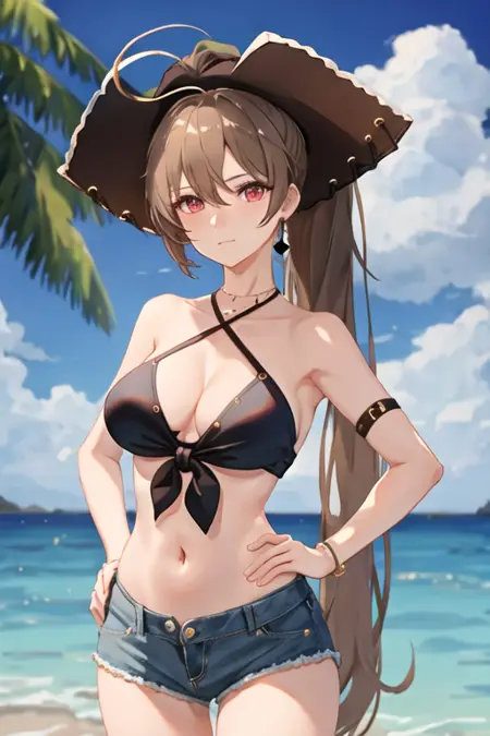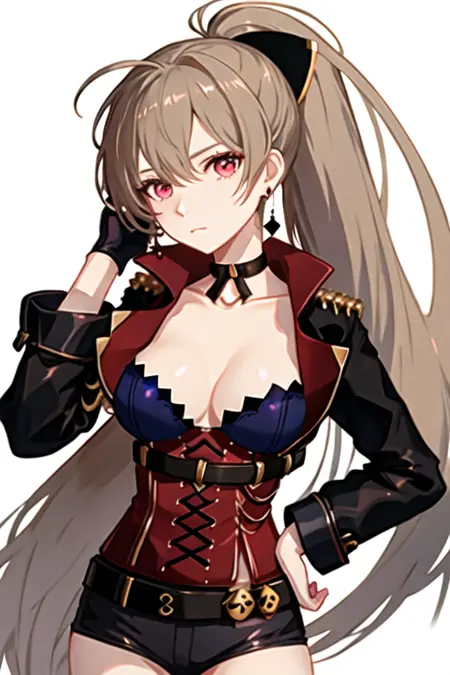 The trigger word is jean_bart_azurlane, and the recommended tags are best quality, masterpiece, highres, solo, {jean_bart_azurlane:1.15}, long_hair, brown_hair, hair_between_eyes, breasts, red_eyes, jewelry, earrings, ponytail, high_ponytail, bangs, collarbone, closed_mouth, medium_breasts, sidelocks, cleavage, very_long_hair, upper_body.