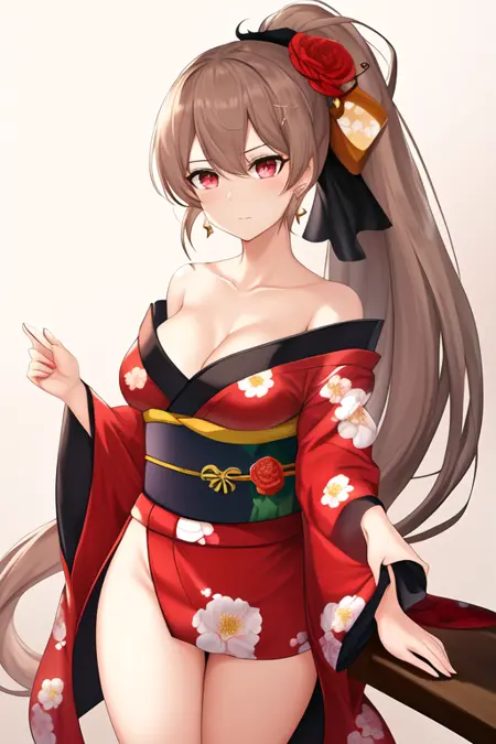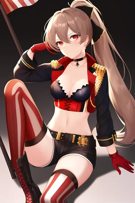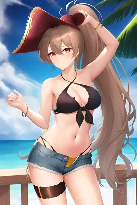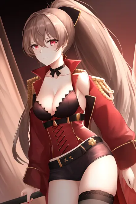 The trigger word is jean_bart_azurlane, and the recommended tags are best quality, masterpiece, highres, solo, {jean_bart_azurlane:1.15}, long_hair, brown_hair, hair_between_eyes, breasts, red_eyes, jewelry, earrings, ponytail, high_ponytail, bangs, collarbone, closed_mouth, medium_breasts, sidelocks, cleavage, very_long_hair, upper_body.