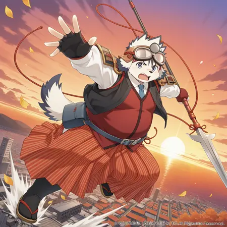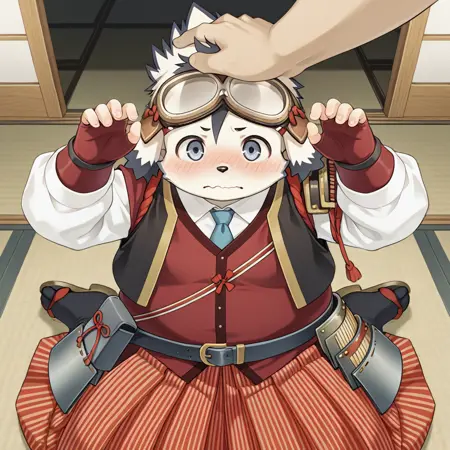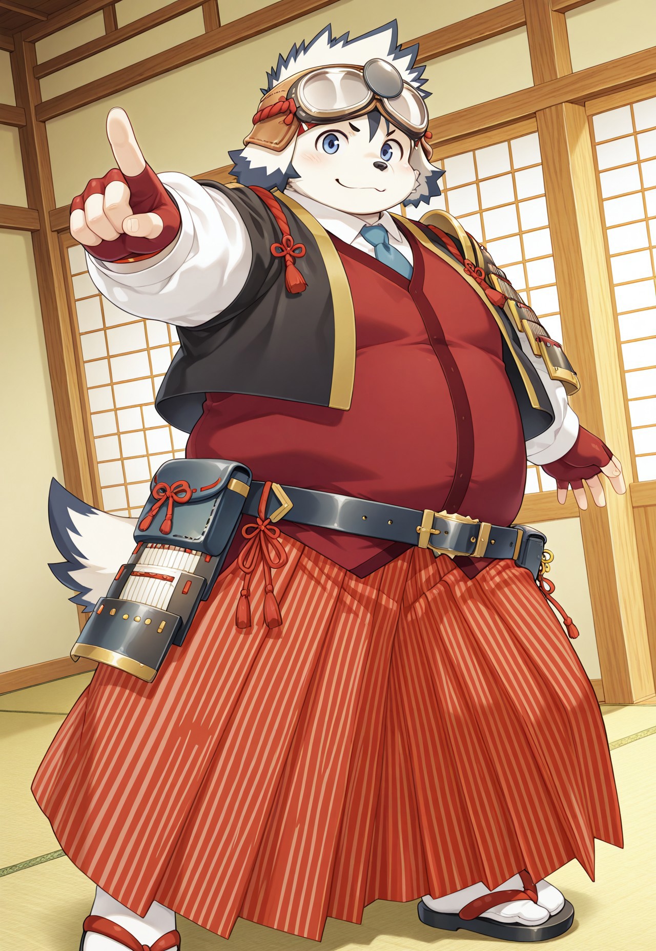 머리 위 안경, 일본 갑옷, 일본 복장, 한쪽 어깨 갑옷, single_sode, 흰 셔츠, 긴 소매, 파란 넥타이, 빨간 베스트, 검은 커트 재킷, 손가락 없음 장갑, 벨트, 허리 팩, 줄무늬 하카마, 검은 타비, 샌들, 겨드랑이 주위 로프,