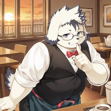 glasses, waiter, red bowtie, black waistcoat, white shirt, sleeves_rolled_up, red belt_bow, blue-black waist apron, black pants, black footwear,