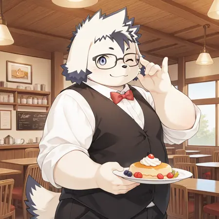 안경, 웨이터, 빨간 리본 넥타이, 검은 웨스트코트, 흰 셔츠, 소매 말아올림, 빨간 벨트 리본, 파랑-검은 허리 앞치마, 검은 바지, 검은 신발,