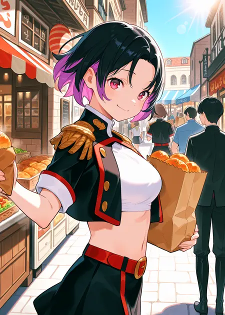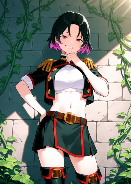 - open jacket, black jacket, epaulets, short sleeves, white crop top, midriff, skirt, thigh boots, red belt