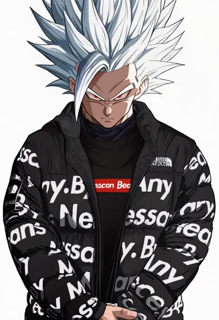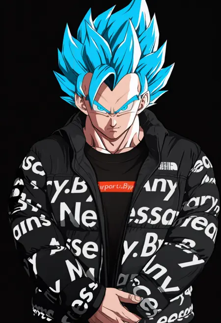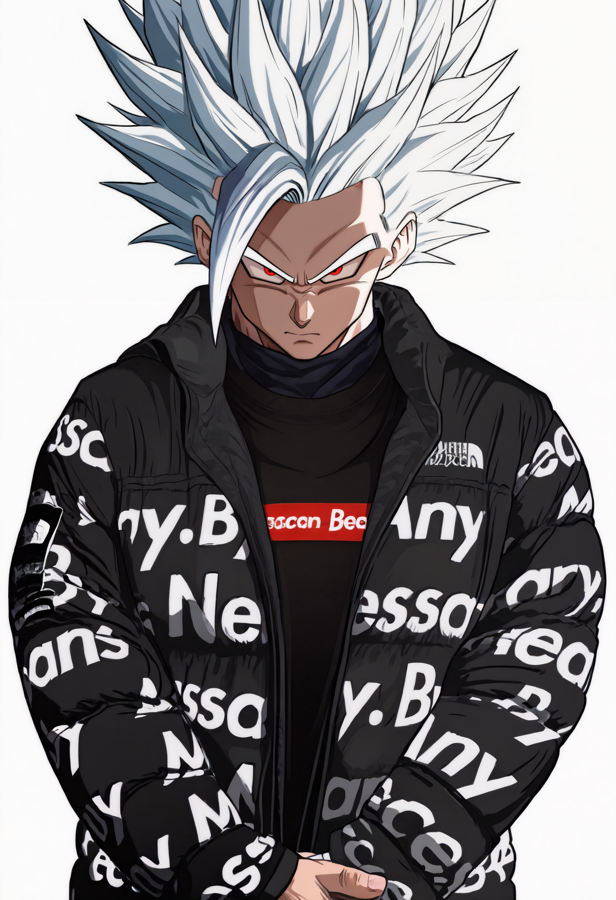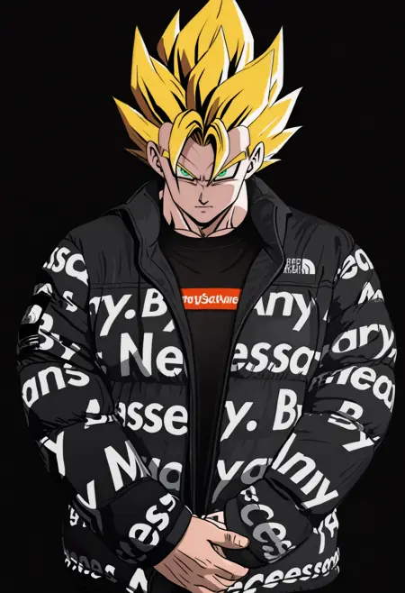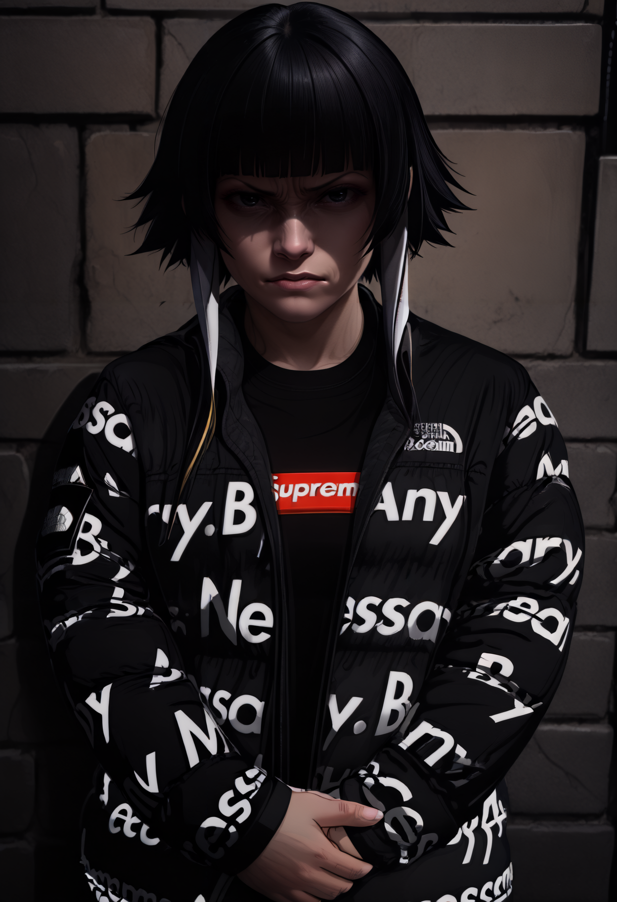 Addtional tags: meme, white background, simple background, black jacket, black shirt, long sleeves, clothes writing, english text, logo, brand name imitation, straight-on, own hands together
