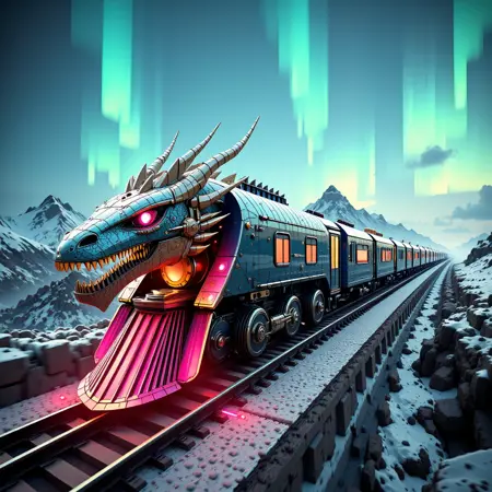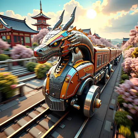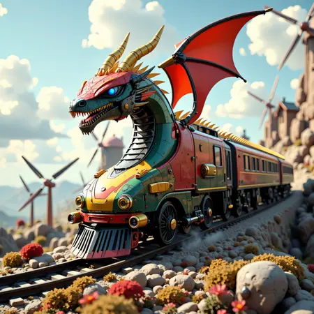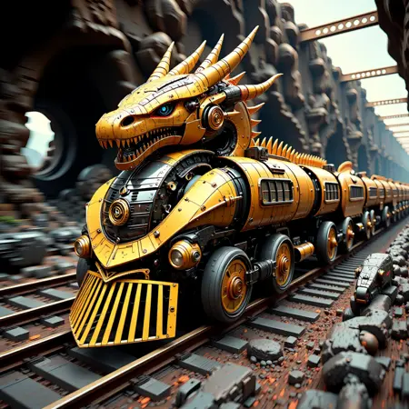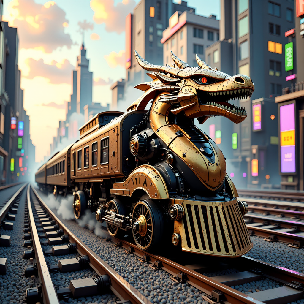 기차와 사이버 드래곤이 결합된 장면, 장대한 영화적 드래곤-기차 풍경, 긴 철로를 달리는 드래곤-기차-차량, 태양광을 활용한 황금 드래곤 기차로 빛을 흡수하는 패널 장착, 높은 대비의 일몰 실루엣, 붉은 바위가 있는 사막 협곡, 드래곤 기차 콘셉트 아트, 바퀴가 고속으로 회전 중, 거대한 금속 드래곤 머리, 초세밀하고 사실적인 사진, 속도 움직임 효과