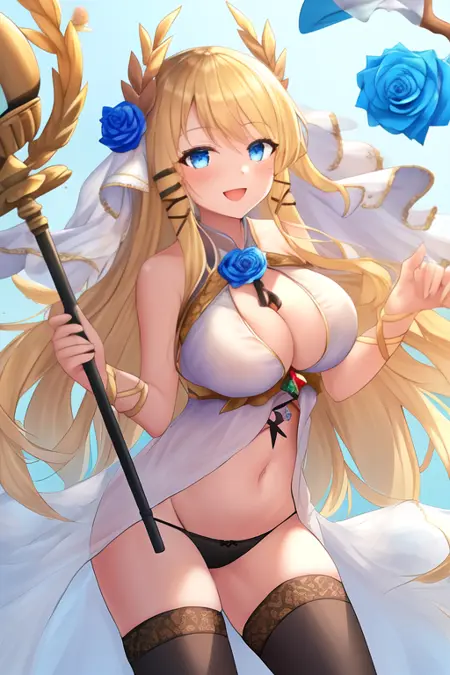 The trigger word is victorious_azurlane, and the recommended tags are best quality, masterpiece, highres, solo, {victorious_azurlane:1.15}, blonde_hair, long_hair, blue_eyes, laurel_crown, breasts, hair_ornament, large_breasts, bangs, ribbon, smile, blush, sleeveless, flower, cleavage, hair_ribbon, open_mouth, very_long_hair, blue_flower, rose.
