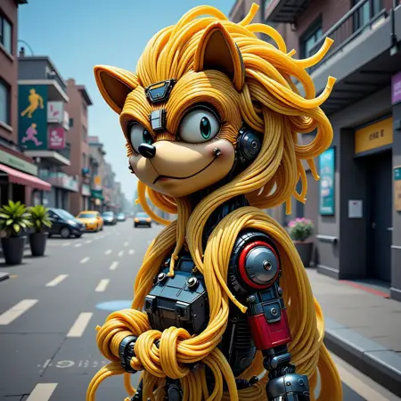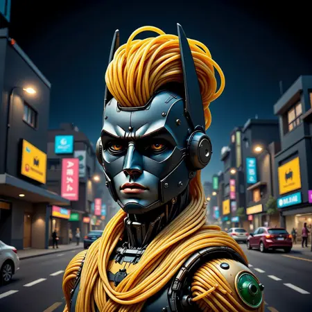 Scooby Dooをアップで、スパゲッティで包まれた機械的なロボットの体、マカロニで包まれたロボットの体と髪、衣装はすべてパスタでできている、ハイパーリアリスティックな写真、体のパーツはパスタでできている、未来派のパスタデザイン、超高精細なフォーカス、スタジオ照明、高詳細なデジタルイラスト、スパゲッティでできたScooby Dooのコンセプトアート、スパゲッティファッションスタイル、都会的なSF風の背景
