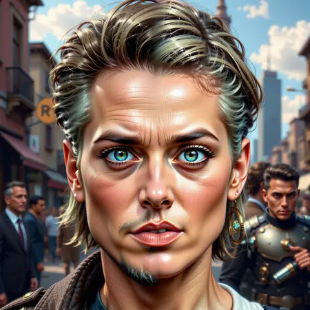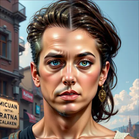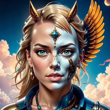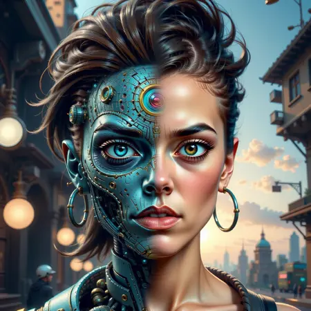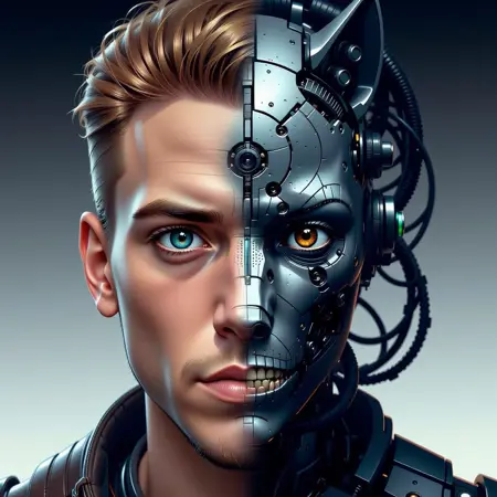 mashUpBlended, half tiger face, and other half alien face, face mashup, A mash-up between two different people, artistic face blend between two different faces, character mashup concept, 2 sides face, ultra sharp focus, high detail photo