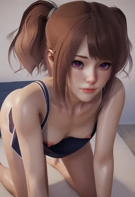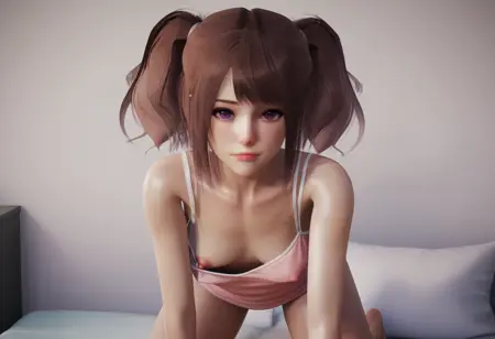 丹娜,双马尾,棕发,紫眼,纤细,刘海,阴毛,小胸,粉色吊带衫,白色短裙