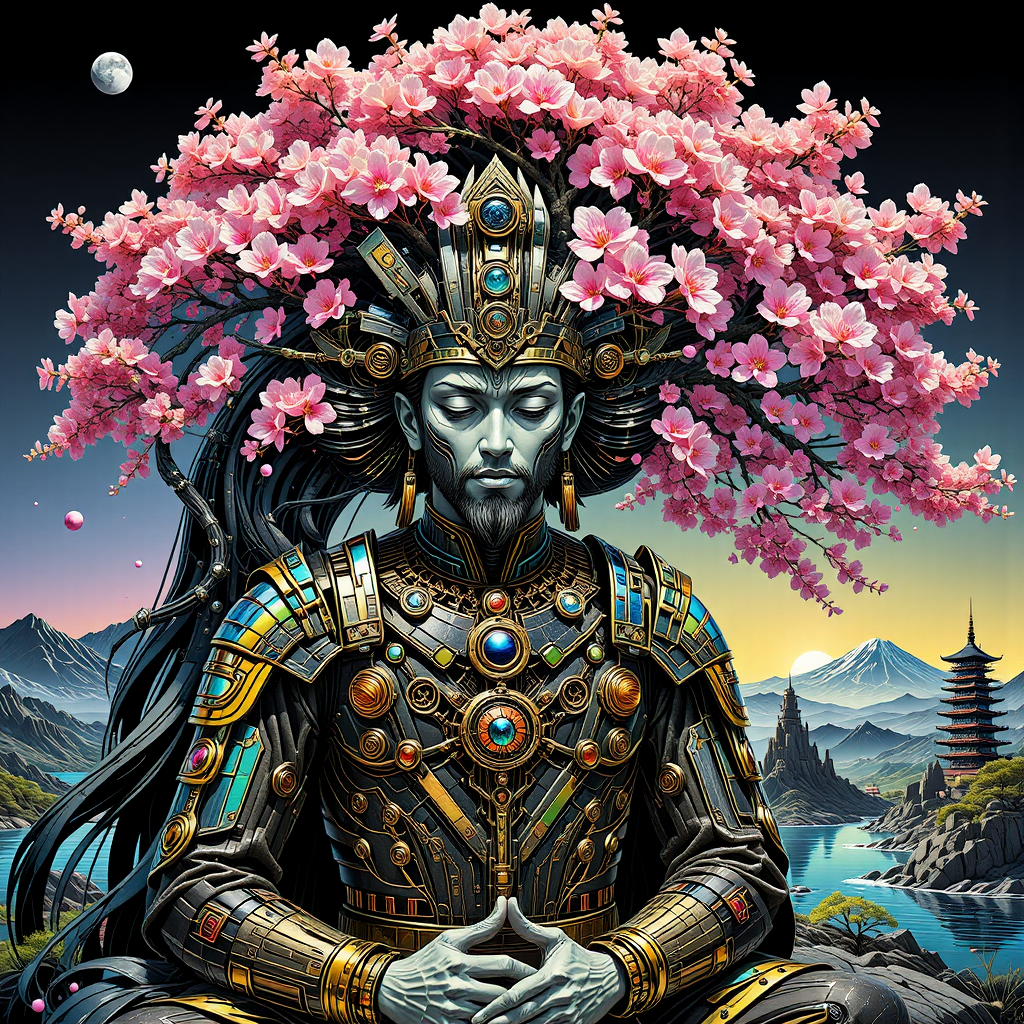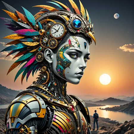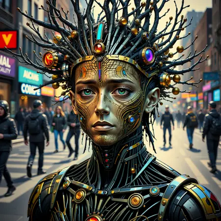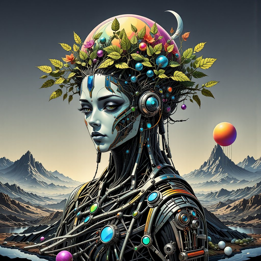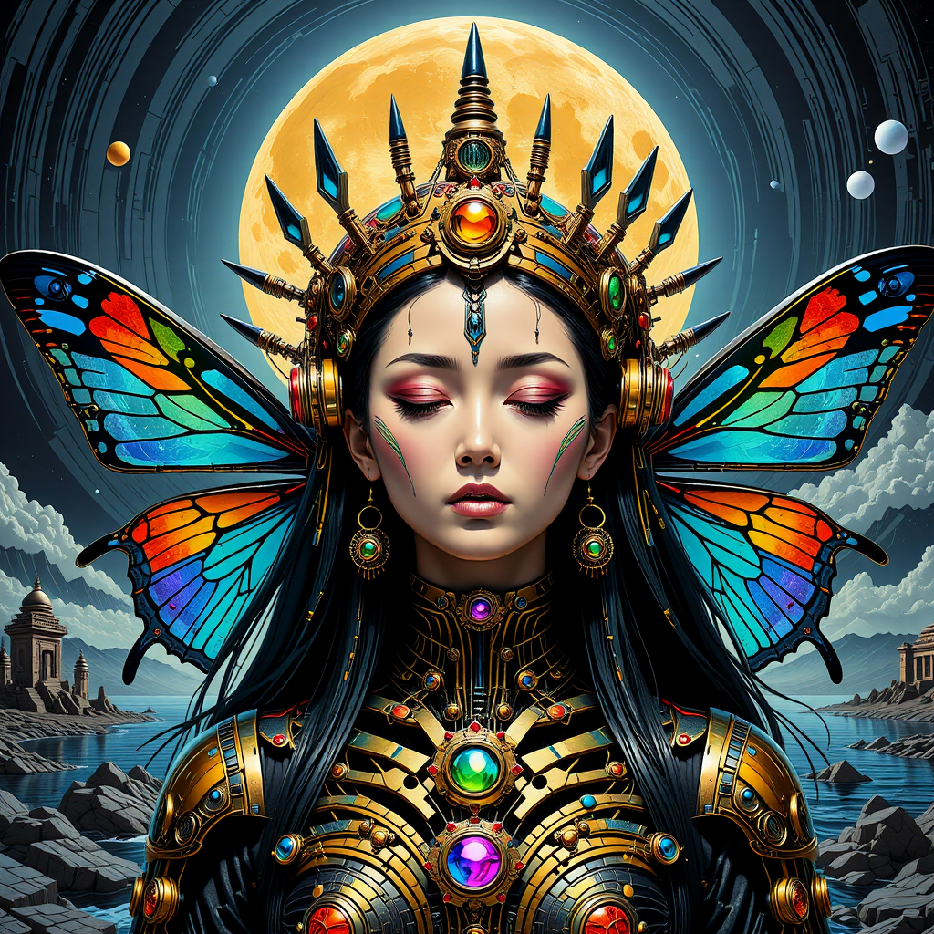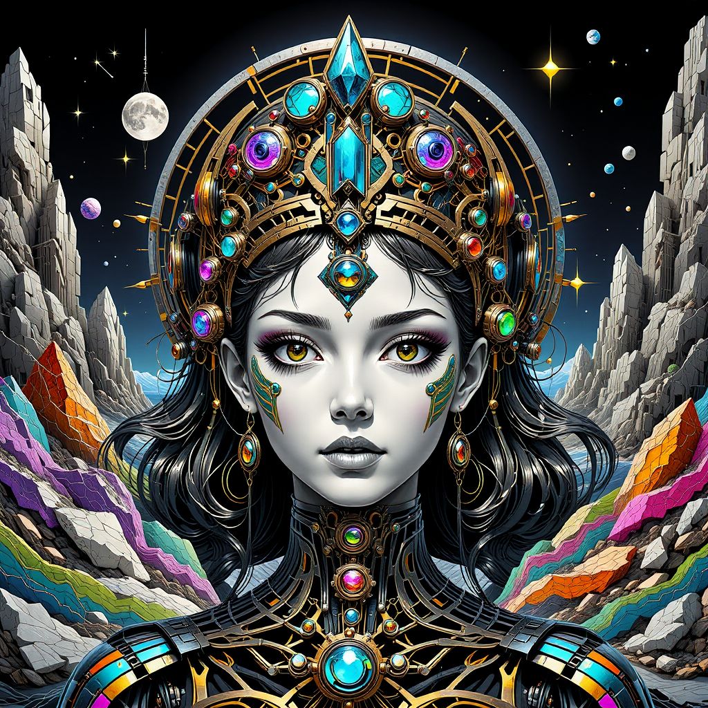 虹色の肌を持つ宇宙人があらゆる Nebula を超える結晶的な宇宙船を操縦し、randomReality アートスタイル、複雑なラインワーク、幾何学模様、金属質のテクスチャ、大胆なコントラストを特徴とするサイバーパンクデジタルアート、サイケデリックで未来志向の美学、反射 surface と流れるデザインをトライバル・メカニカルな融合と組み合わせた作品