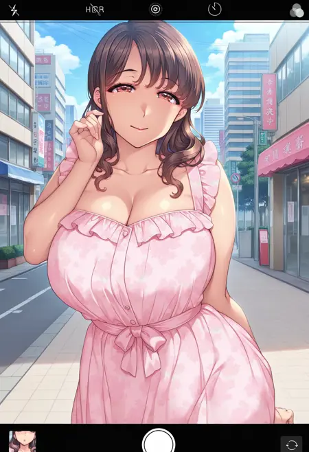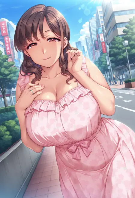 masterpiece, absurdres, newest, 1girl, c-manami, mature female, long hair, brown hair, brown eyes, sleeveless dress, floral print, pink bow, city, outdoors, day, looking at viewer,
