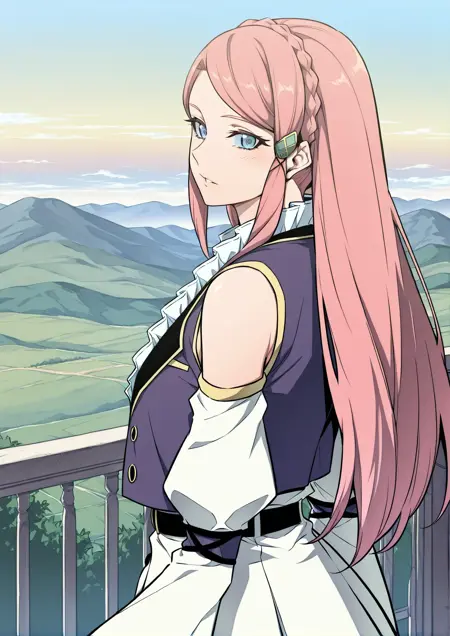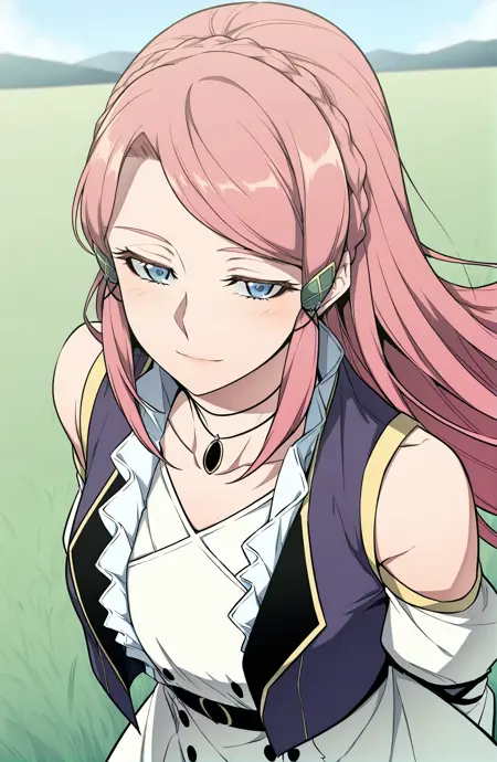 | トレーニングワード | Fiore, 1 girl, solo, blue eyes, long hair, pink hair, braid crown, swept bangs, hair over shoulder, long sidelocks, jeweled hairclip, geometric hair ornament,コピーしました! Fiore_outfit, white blouse, white dress, open shoulder sleeves, black trim, gold trim, double-breasted buttons, black belt, sleeveless purple vest, gold accents, frilled collar, long sleeves, wide sleeves, black pants, pendant necklace, black oval gem,コピーしました! |