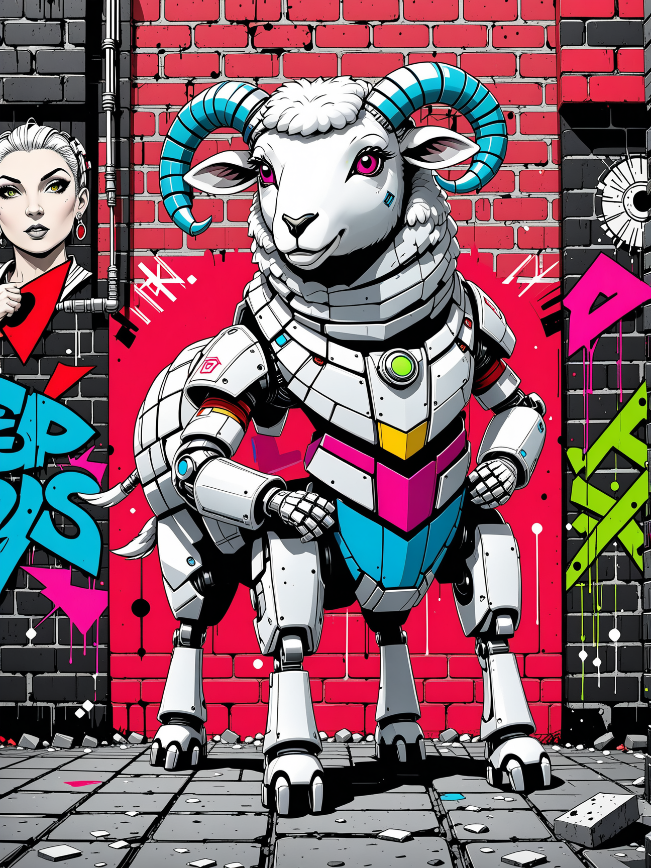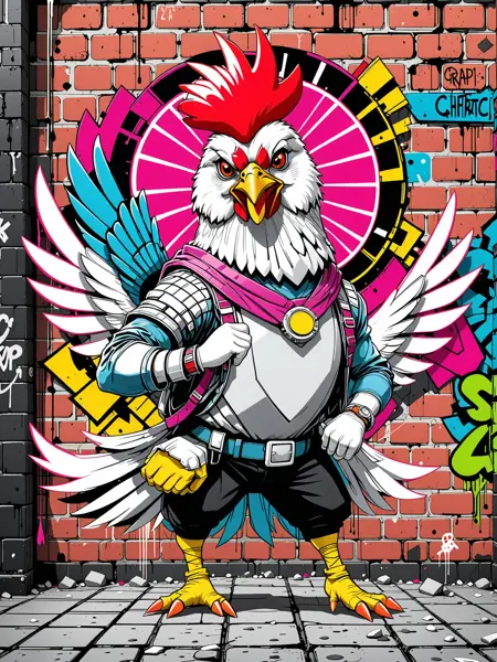 hyperGrafittiToon art style, detailed graffitti cartoon art, brick wall texture background, mechanical phoenix rising, industrial cityscape background