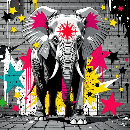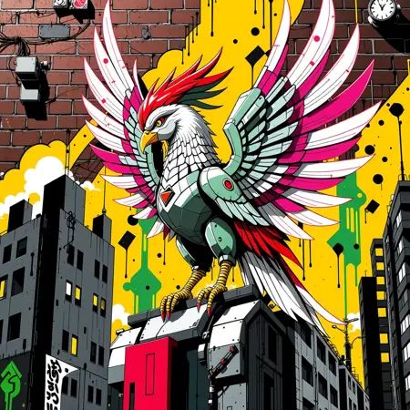 hyperGrafittiToonアートスタイル、詳細なグラフィティカートーンアート、レンガ壁のテクスチャ背景、機械的なフェニックスが昇る、工業都市の背景
