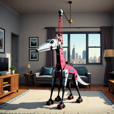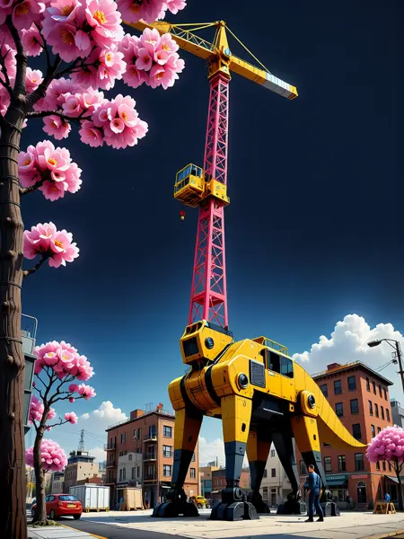 거대한 dinoCrane - 큰 건설 크레인과 큰 공룡의 혼합, 일본 도쿄 도시에서, 산업용 건설 크레인으로 제작, 날카로운 이빨을 가진 공룡 얼굴, 바퀴가 달린 4개의 기계식 다리, craneOsauros crenx, dinoCrane 콘셉트 아트, 기계식 스파이크를 가진 펑크 히피 클럽-공룡, 핑크, 보라, 오렌지 계열의 환상적인 크레인 디자인, 밤에 클럽 옆에 서 있는 모습, 고해상도 디지털 일러스트레이션, 디지털 페인팅, 만화 아트, 초현실적인 3D 아트, 최고 품질, 초예리하고 부드러움, Octane 렌더링, 고해상도 사실적인 사진, 초예리한 초점, 스트리트 사진의 심도 효과, 숲 분위기, Canon EOS RP로 촬영