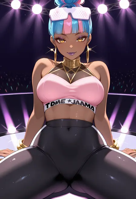 tdqiyana, dark-skinned female, purple lips, jewelry, hoop earrings, makeup, yellow eyes, single hair bun, bracelet, gold nails, eyewear on head, blunt bangs, mole under eye, two-tone hair, blue hair, pink hair, pink crop top, black yoga pants, purple eyeshadow,
