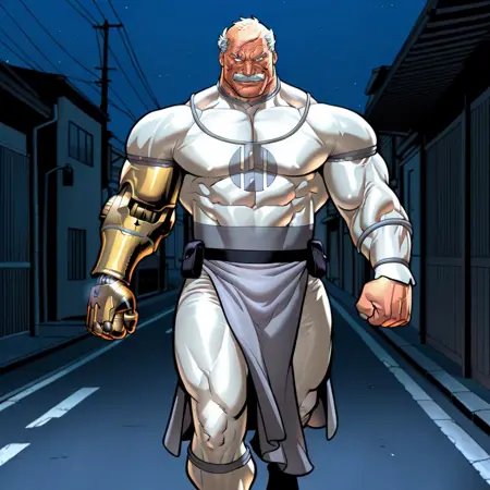征服、白发、白色胡须、黄眼、眼部疤痕、白色紧身衣、标志、腰带、裙子、白色长裤、金色义肢手臂