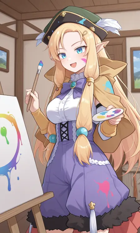 Daria, elf, blond hair, blue eyes, hat, paint on clothes, paint on cheek, capelet,