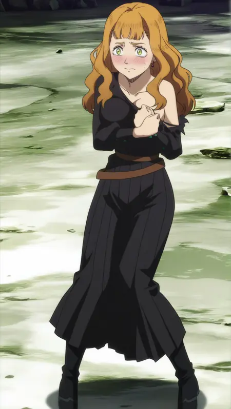 black outfit, black dress, belt, black boots, jewelry, earrings, breasts, large breasts,