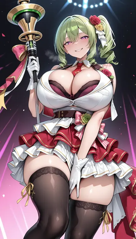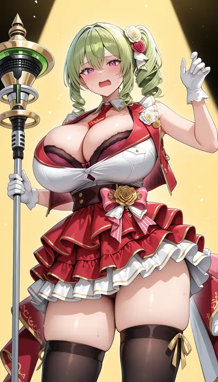Erat0_stan,drill hair, idol clothes, huge breasts, white gloves, green hair, purple eyes, layered skirt, gold high heels, rose, red necktie, bra peek, holding staff,frills, hair ornament,side ponytail, hair flower,white vest,black thighhighs,