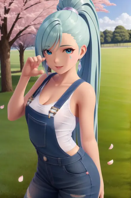 <lora:Seraphine-v1-07:0.6>, ChopioSeraphine, blue hair, green hair, multicolored hair, long hair, high ponytail, hair tie, blue eyes, earrings, hair ornament, gem, facial mark, shiny, mascara, (looking at viewer:1.3),