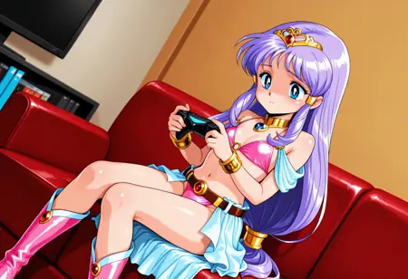触发词:JuliaCL,复古艺术风格,蓝色眼睛,紫色头发,非常长的头发,王冠,珠宝,发饰,金色手镯,粉色比基尼,金属腰带,短款歌舞女郎裙,短款分离袖,粉色靴子,