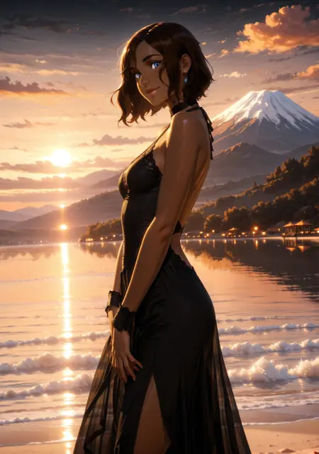 外貌:1个女孩,单独一人,蓝眼睛,棕色头发,长发,侧分刘海,束发,单发髻,深色皮肤,深色皮肤女性