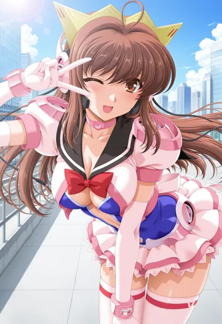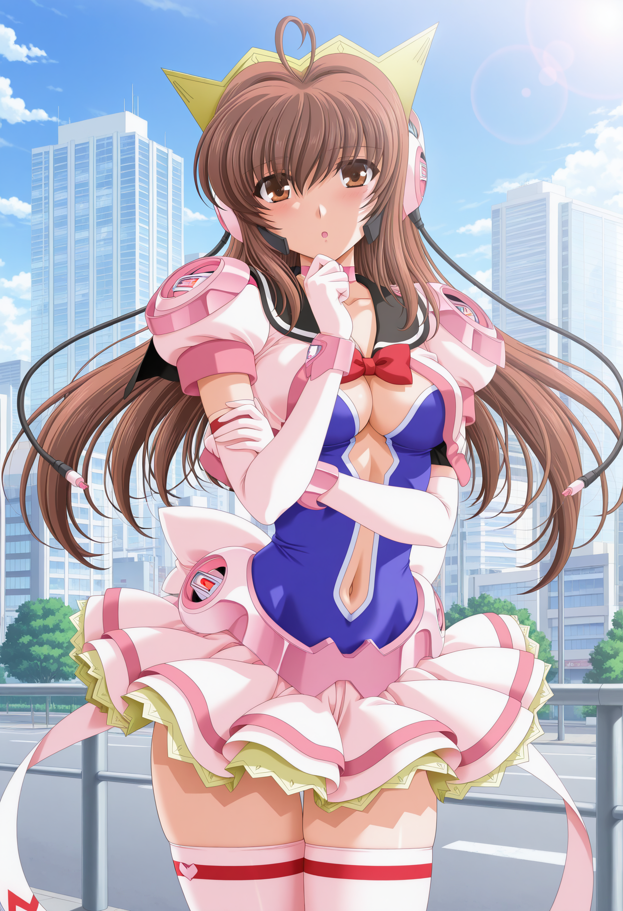 masterpiece, absurdres, newest, 1girl, c-sym, long hair, brown hair, brown eyes, crown, headphones, pink cropped jacket, red bowtie, pink choker, black sailor collar, blue leotard, center opening, puffy short sleeves, elbow gloves, miniskirt, pink thighhighs, day, city, outdoors, looking at viewer, lens flare,