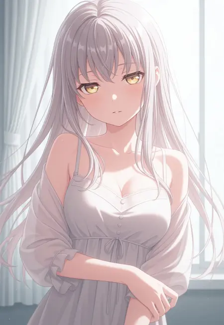 yukinya, long hair, grey hair, yellow eyes, bangs, medium breasts