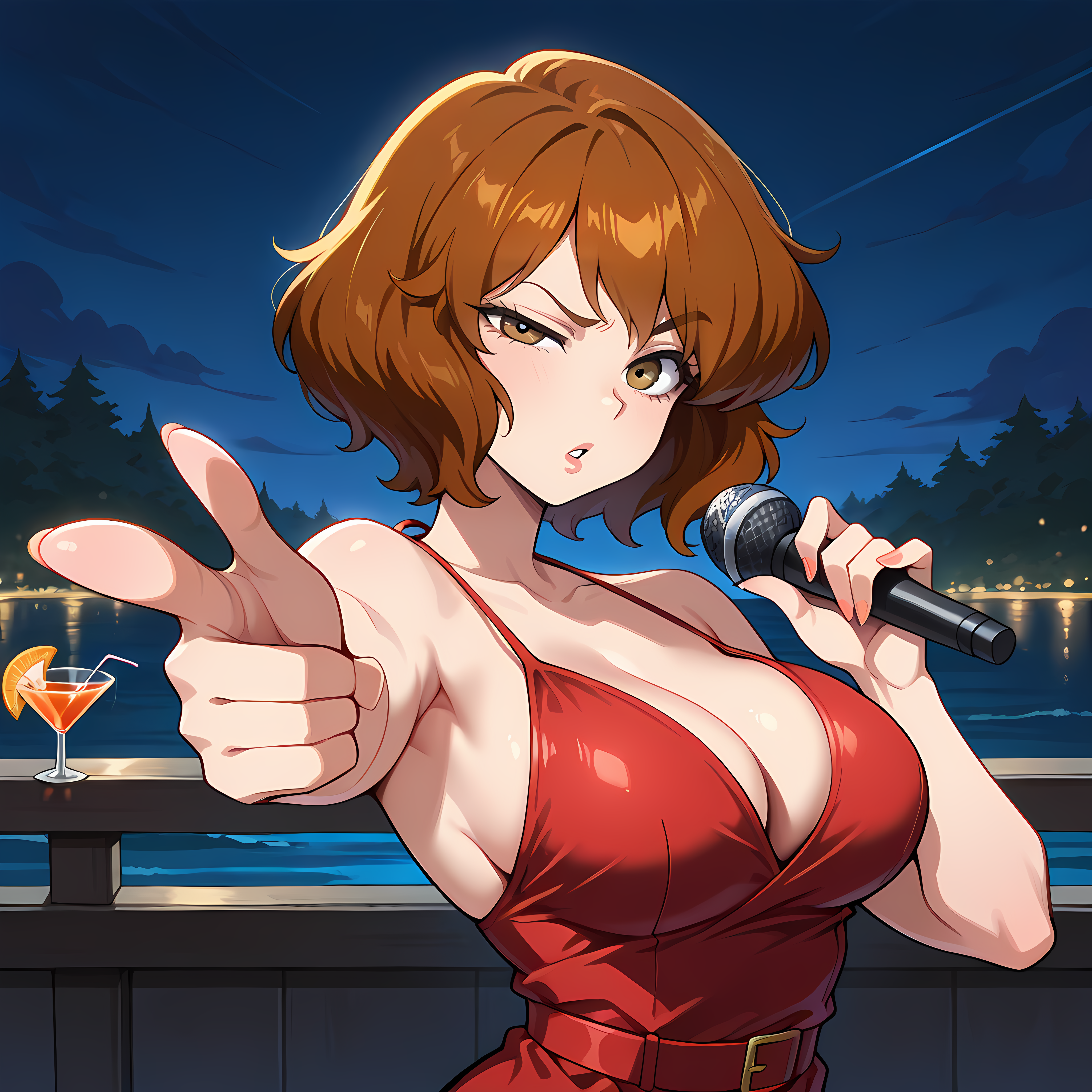 옵션: 갈색 머리, 단발, 노란 점프수트, 흰색 부츠, 흰색 벨트, 마이크 들고 있음