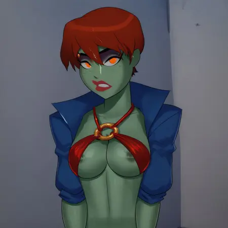 lipstick, red hair, long hair, orange eyes, freckles, colored skin, green skin, blue cape, blue skirt, gloves, superhero, MissMartianSU