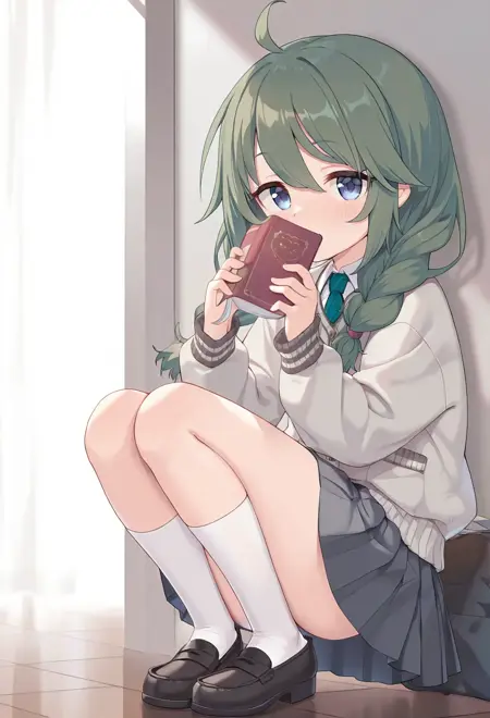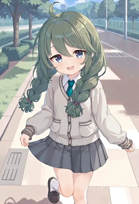 yuni-real,yuni \(princess connect!\),蓝色眼睛,绿色头发,双马尾,呆毛,校服,灰色开衫,百褶裙,白色袜子,乐福鞋