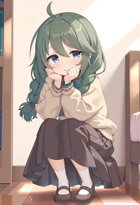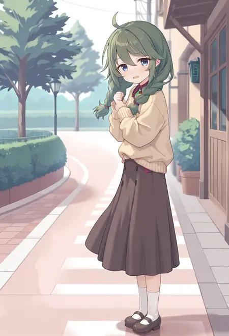 yuni-real,yuni \(princess connect!\),蓝色眼睛,绿色头发,双马尾,呆毛,黄色毛衣,红色衬衫,棕色长裙,白色短袜,棕色玛丽珍鞋