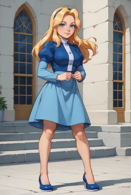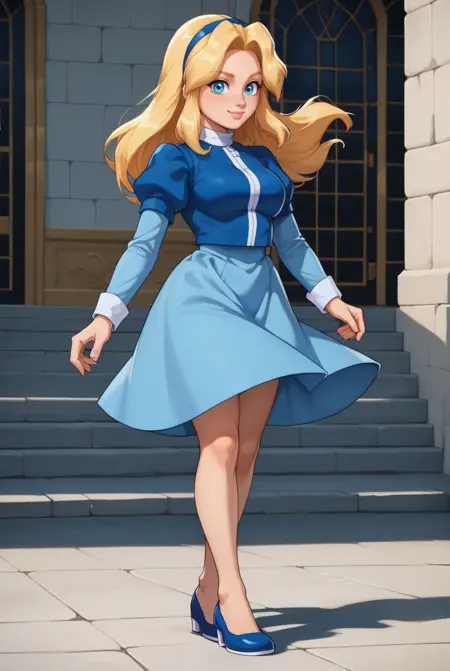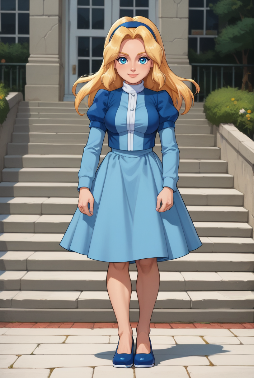 Maria Robotnik, blonde hair, hairband, long wavy hair, puffy short sleeves, blue dress, white collar, knee-length skirt, blue flat shoes