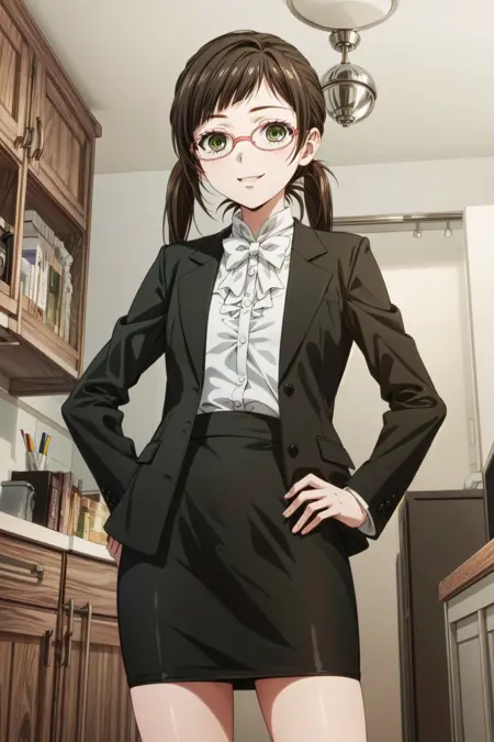 sakufukuzawa, brown hair, green eyes, ponytail, formal, jacket, glasses, twintails, bowtie, long sleeves, collared shirt, pencil skirt, white shirt, black skirt