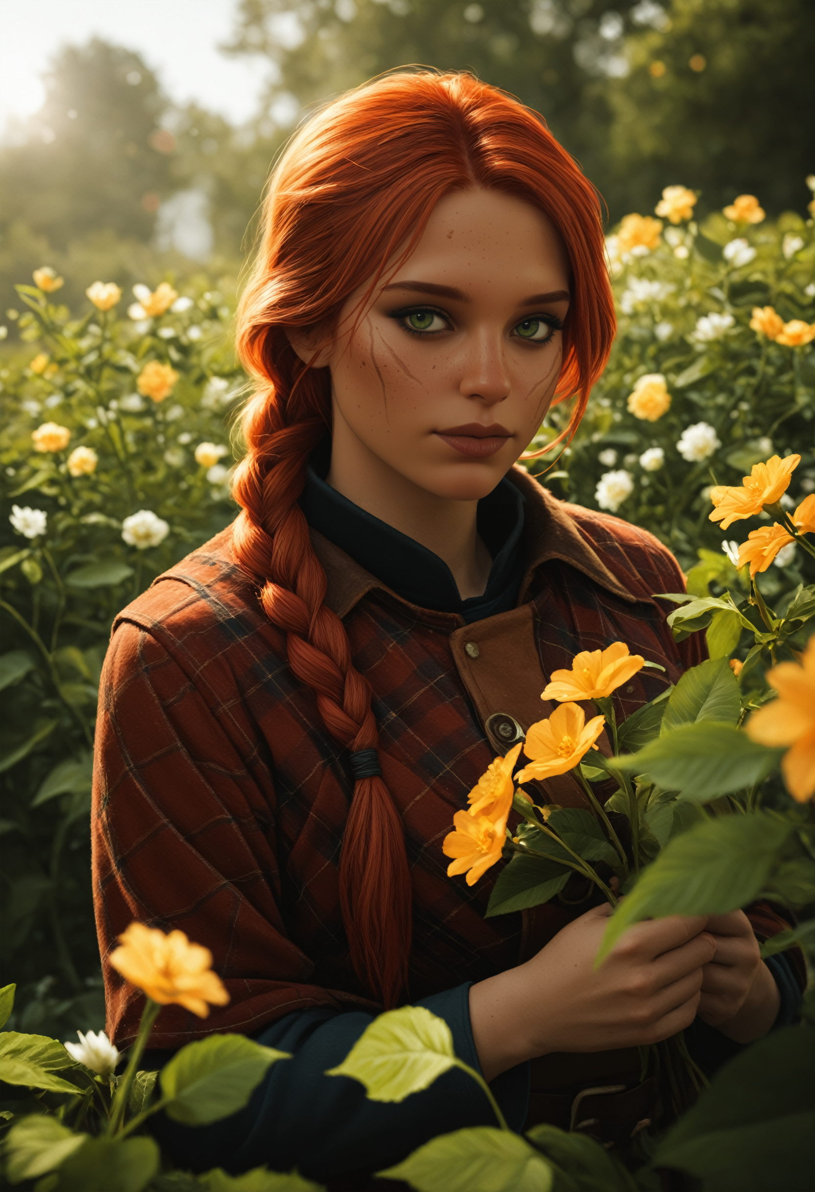 W3Cerys, 1girl, long hair, braid, red hair, green eyes, scar, freckles