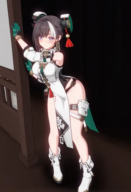 bare shoulders, detached sleeves, closed mouth, green gloves, hair ornament, breasts, boots, earrings, jewelry, white footwear, dress, pelvic curtain, sleeveless, thigh strap, hair bun, white dress, braid, headgear, chinese clothes, tassel, china dress,