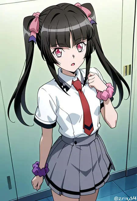 프롬프트: senki zesshou symphogear, twintails, crimson eyes, pink-framed eyewear, black hair, glasses, crossed arms, long hair, twintails, jewelry, pink eyes, necklace, looking at viewer, outdoors, tree, bangs, blunt bangs, multiple girls, sky, day, solo, 1girl, shiny hair, skirt