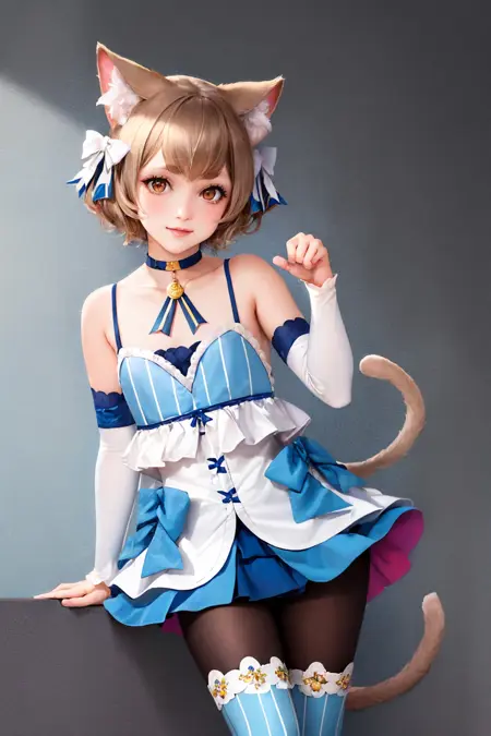Default Outfit: hair bow, dress, striped, ribbon, detached sleeves, pantyhose, blue choker, tail, collarbone, bare shoulders