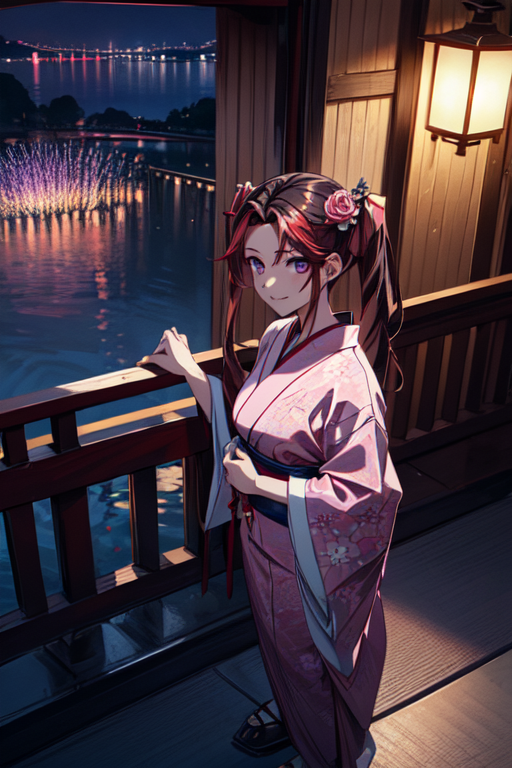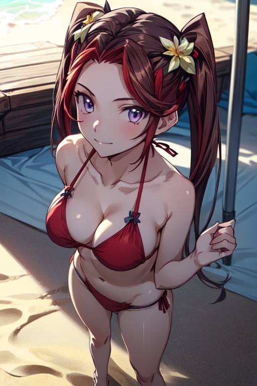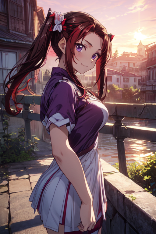 ray_1, brown hair, red hair, twintails, long hair, purple eyes, two-tone hair, hair ornament, small breasts, medium breast, large breast, white footwear, short dress, boots,