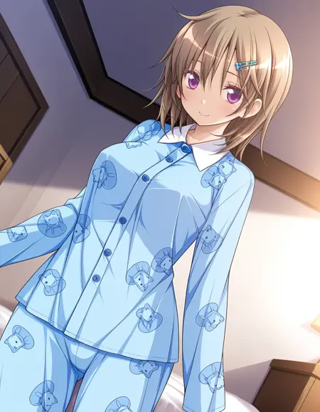 outfit05, hairclip, floral hairclip, pajamas, animal prints pajamas, blue pajamas, shirt, collared shirt, long sleeves, sleeve past wrist, pants,