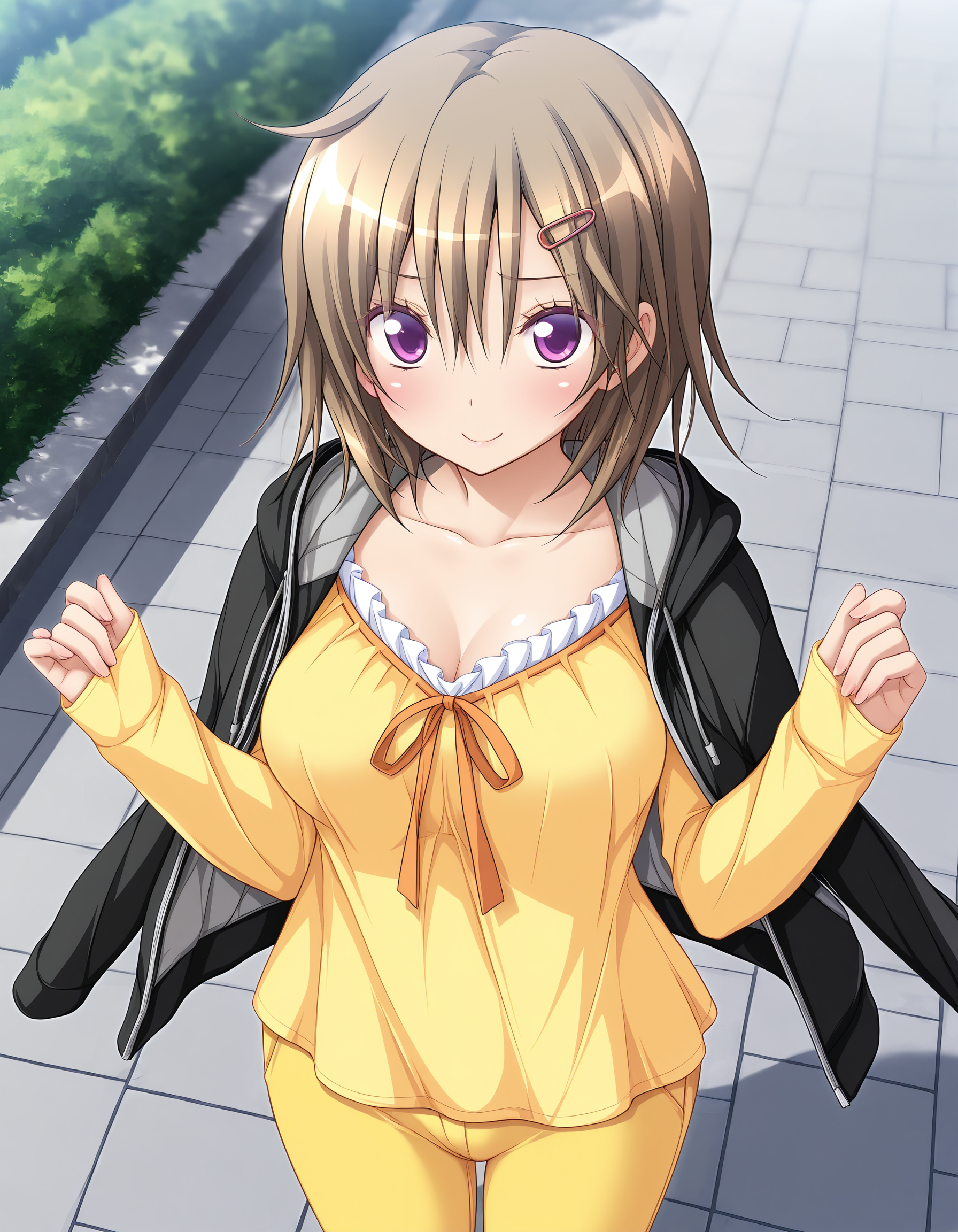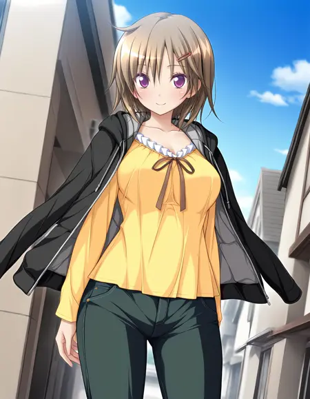 outfit04, hairclip, jacket, black jacket, hooded jacket, open clothes, opened jacket, jacket on shoulders, shirt, yellow shirt, frilled shirt, long sleeves, pants, yellow pants,