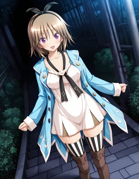 outfit03, hairband, black hairband, bow hairband, coat, blue coat, open clothes, open coat, neck ribbon, black neck ribbon, dress, short dress, white dress, thighhighs, vertical-striped thighhighs, boots, long boots, brown boots,
