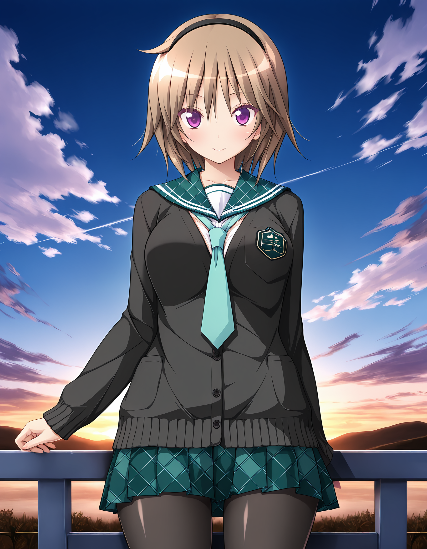 outfit01, hairband, black hairband, cardigan, black cardigan, sailor colla, argyle plaid sailor colla, green sailor collar, tie, light green tie, skirt, argyle plaid skirt, green skirt, pleated skirt, pantyhose, black pantyhose,